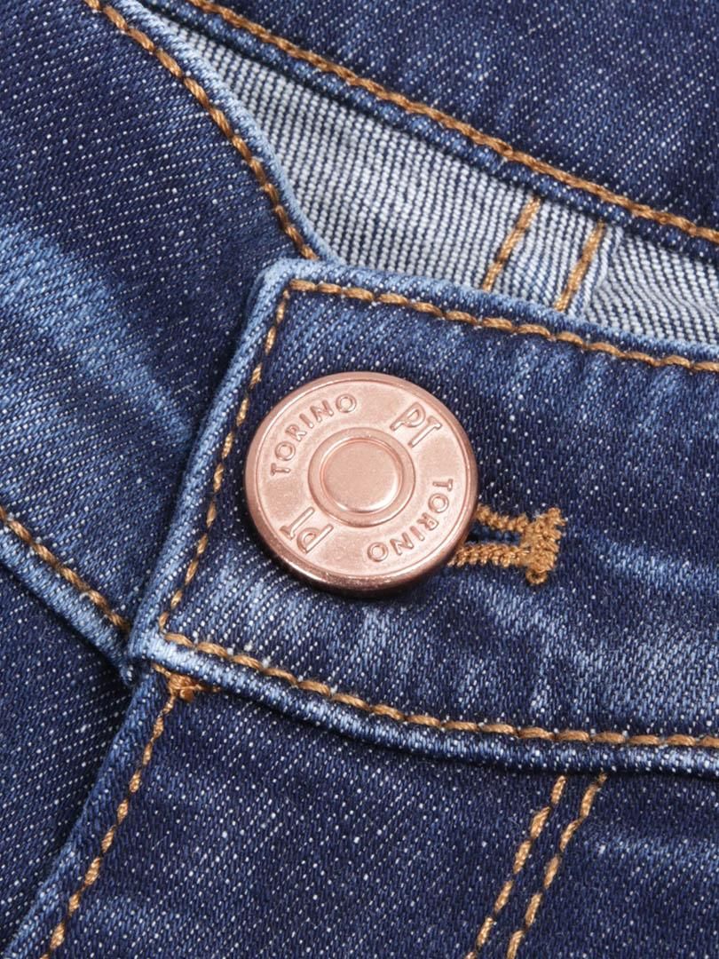 フロントファスナー仕様。ブランドネーム入りのオリジナルファスナーとボタンとリベット。