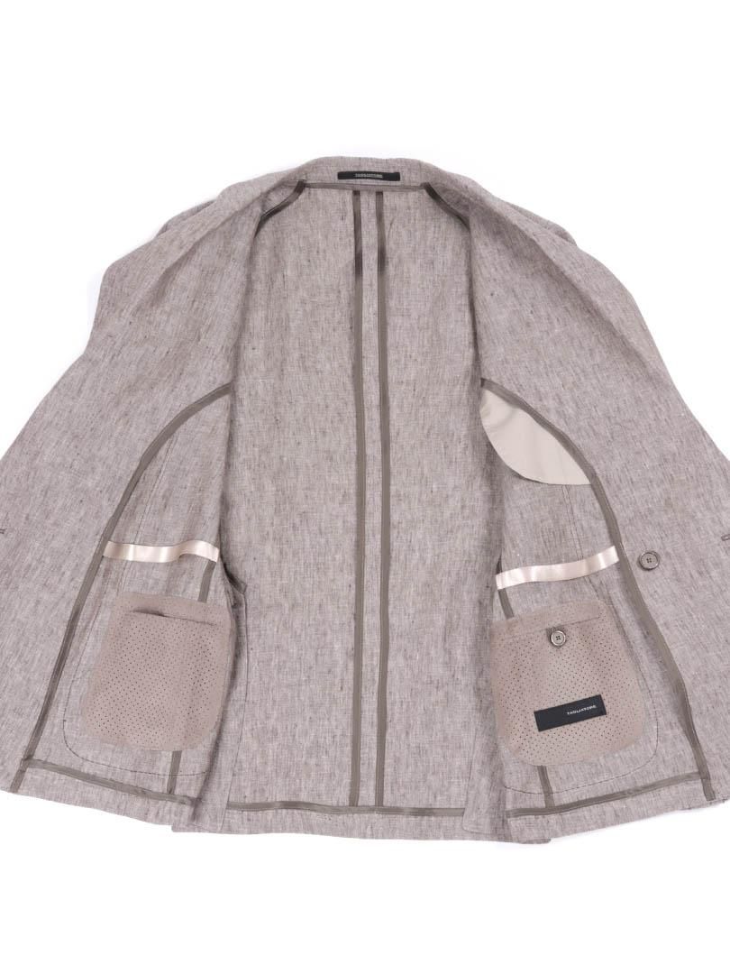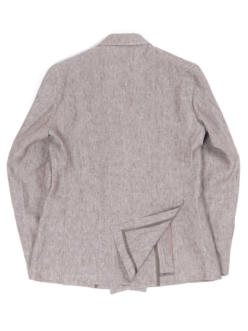 スラブ(凹凸)感のある平織組織。パッチポケット。サイドベンツ。オリジナルのラペルピンが付属。アンコン一枚仕立て。内ポケット2つ。