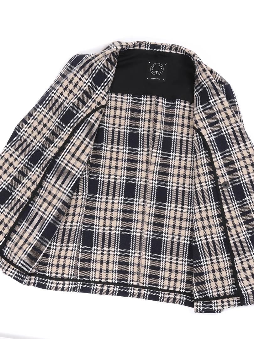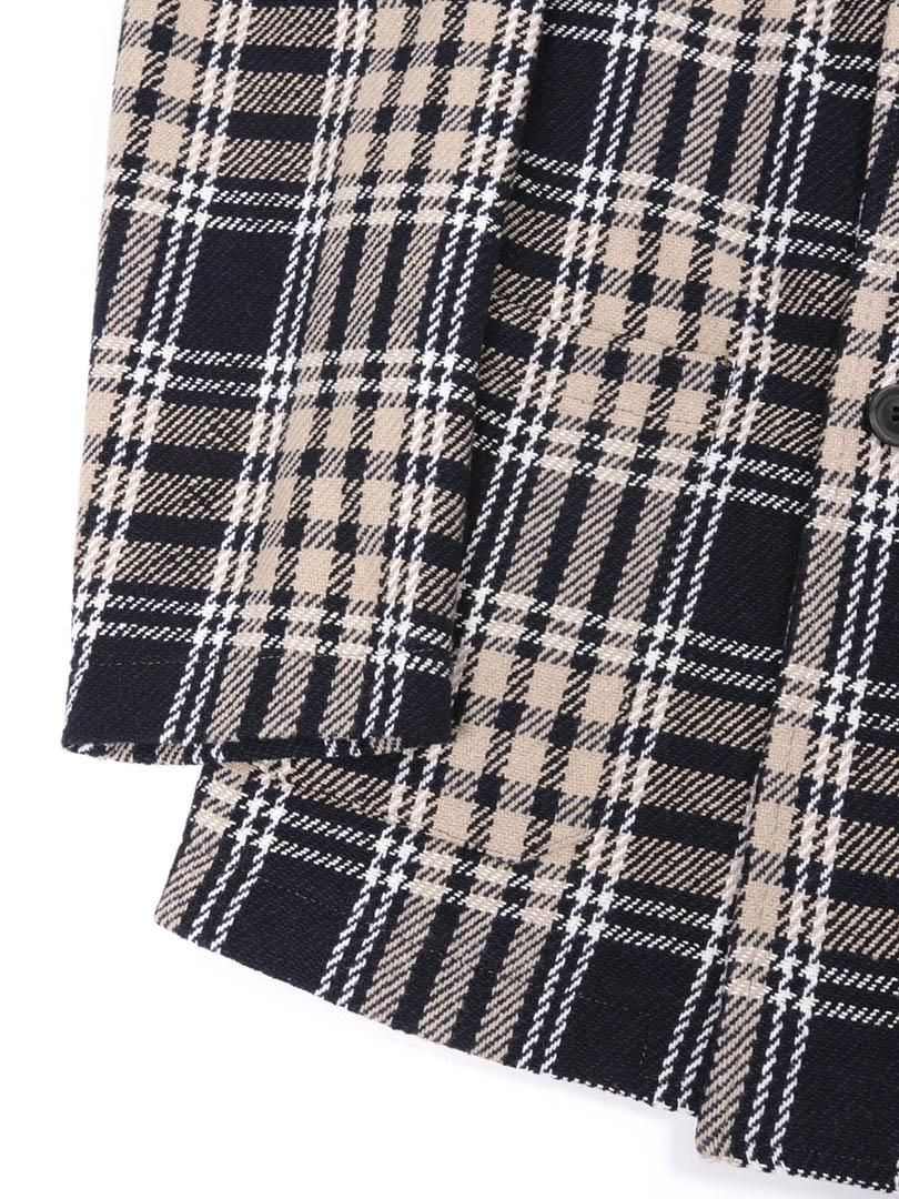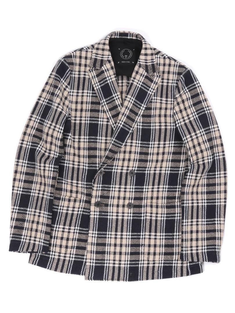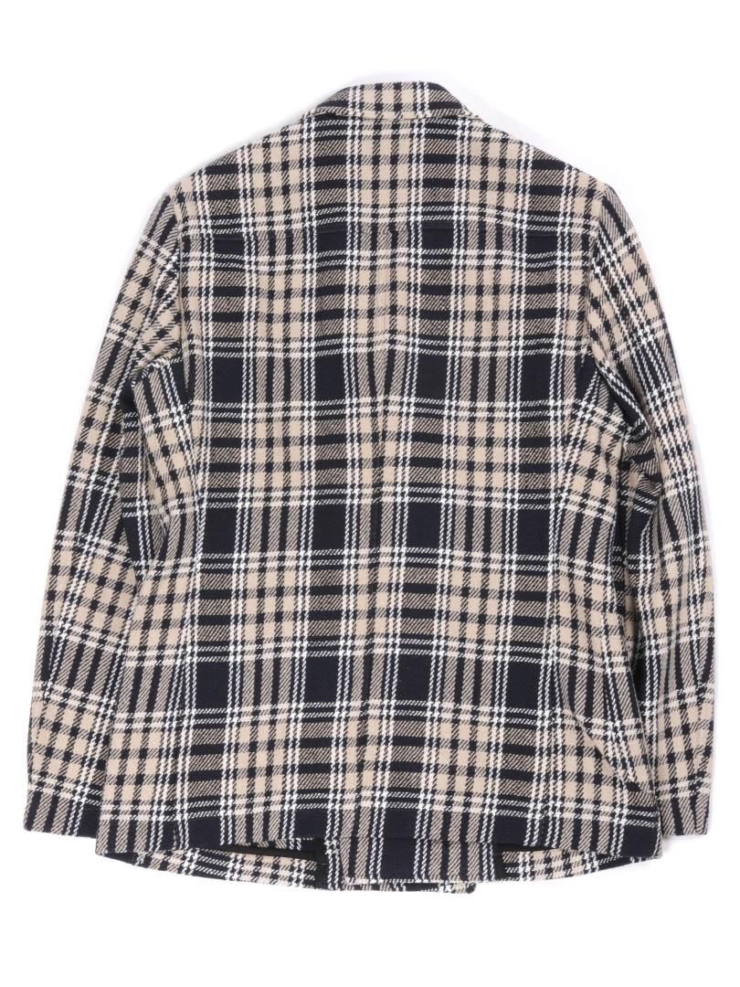 【 商品コメント 】 コットンポリエステル混紡のチェック地を使用したダブルジャケットです。 ブランドネームの刻印入りのオリジナルボタン。背抜き仕立て。ノーベント。袖筒。スリムフィット。