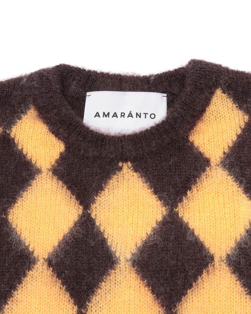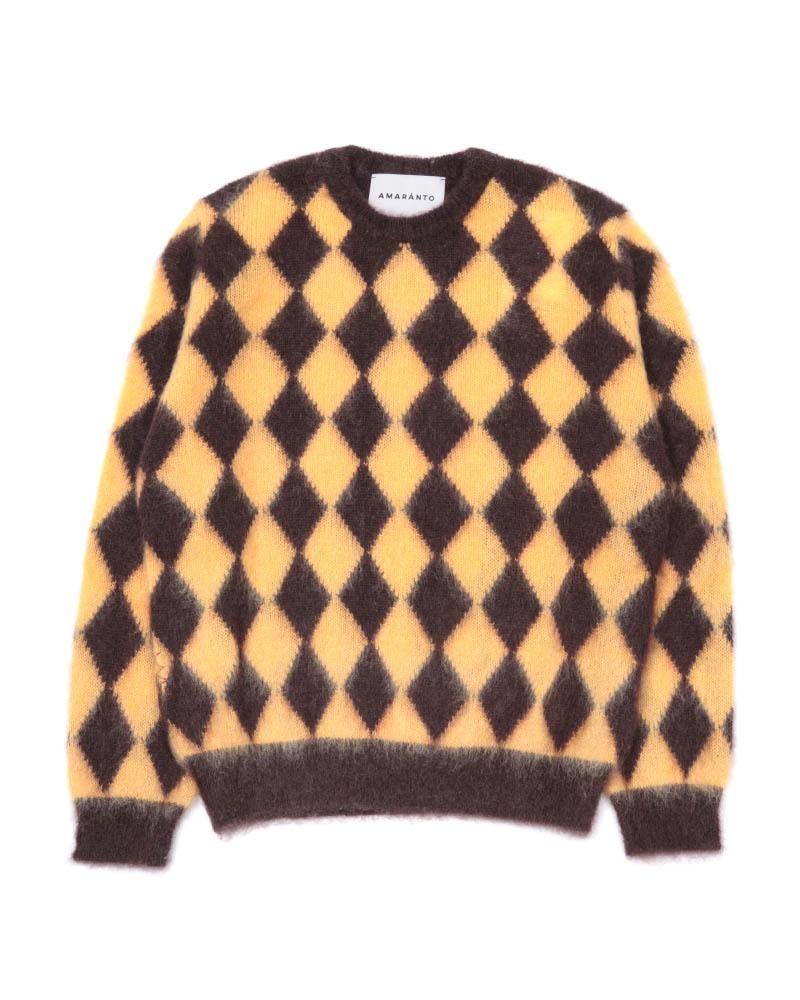 素材はモヘアを中心にポリエステルとウールを混紡したダイヤパターンニット。